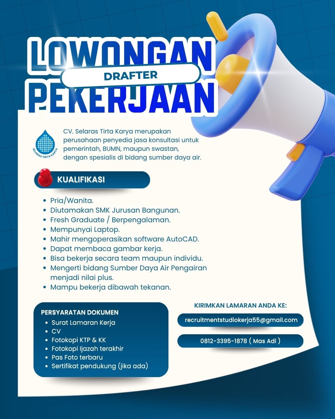 📢 PENGUMUMAN LOWONGAN KERJA 📢 🔥 WE ARE HIRING 🔥 CV.Selaras Tirta Karya perusahaan konsultan sumber daya air yang menyediakan layanan perencanaan, studi, dan desain