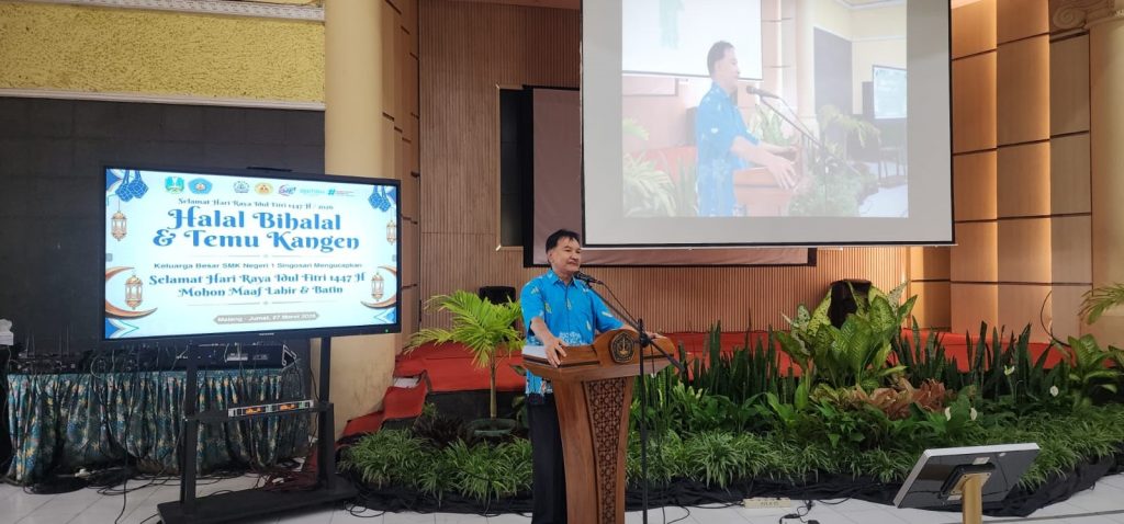 Malang, 27 Maret 2026 – Dalam suasana penuh kehangatan dan kebersamaan pasca Hari Raya Idul Fitri 1447 H, SMKN 1 Singosari menggelar acara Halal Bihalal yang diikuti oleh seluruh guru, staf, dan karyawan. Kegiatan ini menjadi momen penting untuk mempererat tali silaturahmi sekaligus saling memaafkan setelah menjalani ibadah di bulan suci Ramadhan.