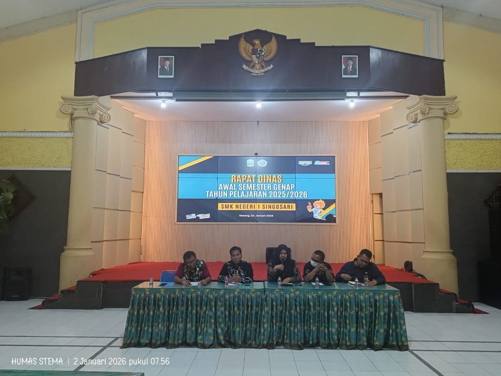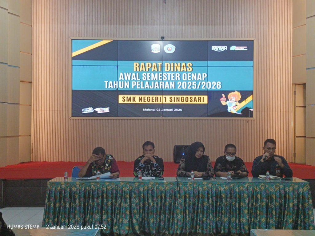 SMK Negeri 1 Singosari menggelar Rapat Dinas Awal Semester Genap Tahun Pelajaran 2025/2026 pada Jum’at 2 Januari 2026 yang diikuti oleh seluruh guru dan tenaga kependidikan. Kegiatan ini dilaksanakan di aula sekolah sebagai agenda strategis untuk menyelaraskan program kerja, meningkatkan kedisiplinan, serta memperkuat komitmen bersama dalam pelaksanaan layanan pendidikan pada semester genap.